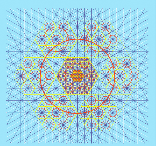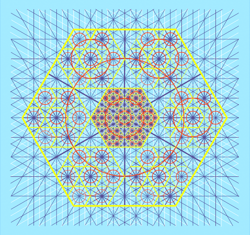 In fig. 94, the whole original Creation can be seen lying exactly under the Seventh Triune Triune Super Universe of the New. For simplicity, the myriads of radiating micro staff lines and extending Starrs of David from within the smaller cubits of the first Creation are not depicted, otherwise it would be nearly a homogeneous smear.