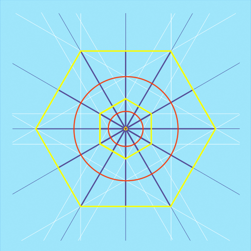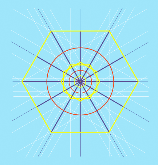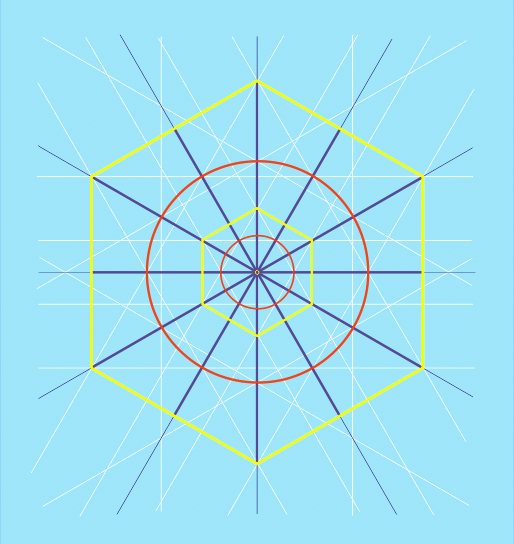 To begin the oriented cubit, the same new circle of Intelligence was used. A new Starr of David was emanated at ninety degrees to the original by aligning its arms to the intersections of the staffs and newly expanded circle. By symmetry, the six new Starr of David end points were located out along the Rods past the cube. (Fig. 59).