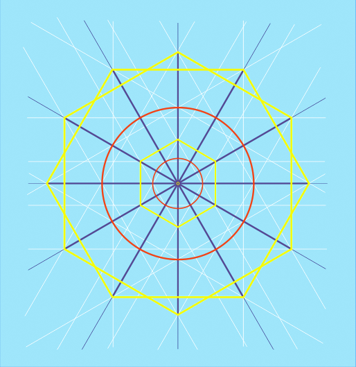 By the expansion rule, each successive lower dimension was larger than the one above. In the depiction below, nine is the largest, eleven is the tiny yellow cubit in the middle and twelve is too small to be seen. (Fig. 57).